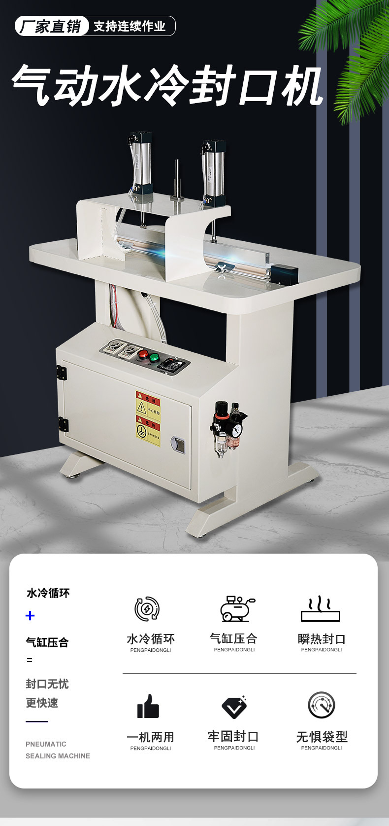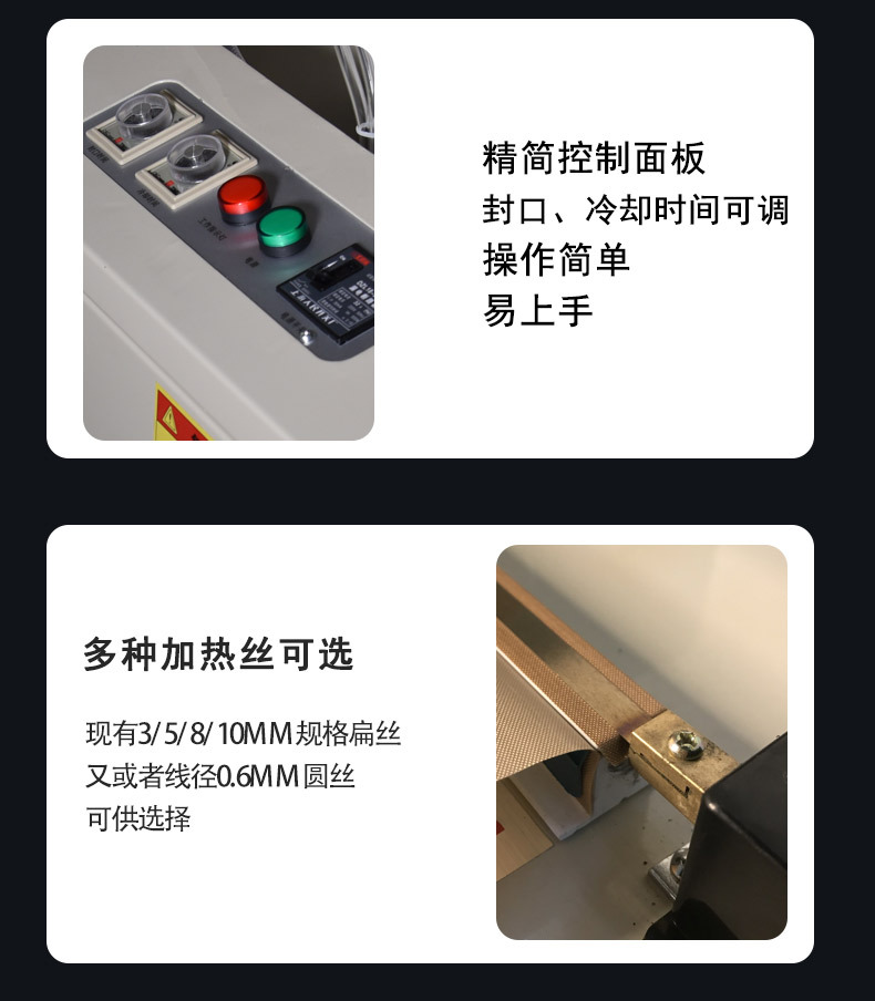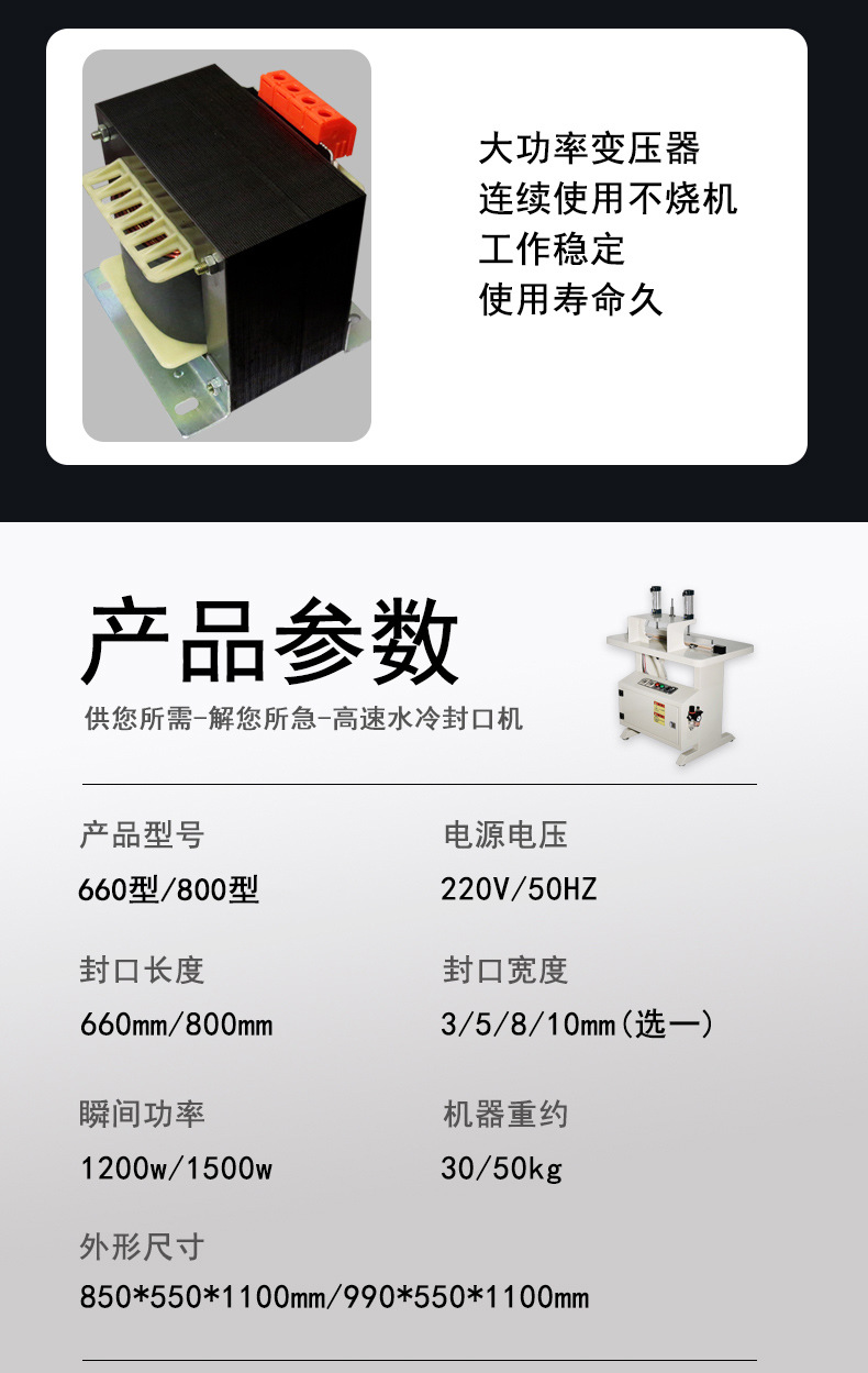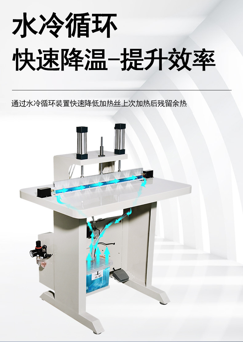 水冷封口机广泛应用于多个行业。在食品饮料领域,用于真空包装肉制品、桶装水封膜,保障产品保鲜与运输安全;医药行业中,满足无菌包装需求,如疫苗注射器包装、药品铝箔袋密封;化工行业可对农药桶、锂电池电解液包装进行防爆密封;日用品行业则用于日化产品、湿巾包装,提升包装效率与品质。相较于传统热封机,水冷封口机封口效率提升 50%,封口强度达材料本体强度的 85%-95%,且能适配 0.05-0.5mm 厚度的膜材,能耗分布更合理。