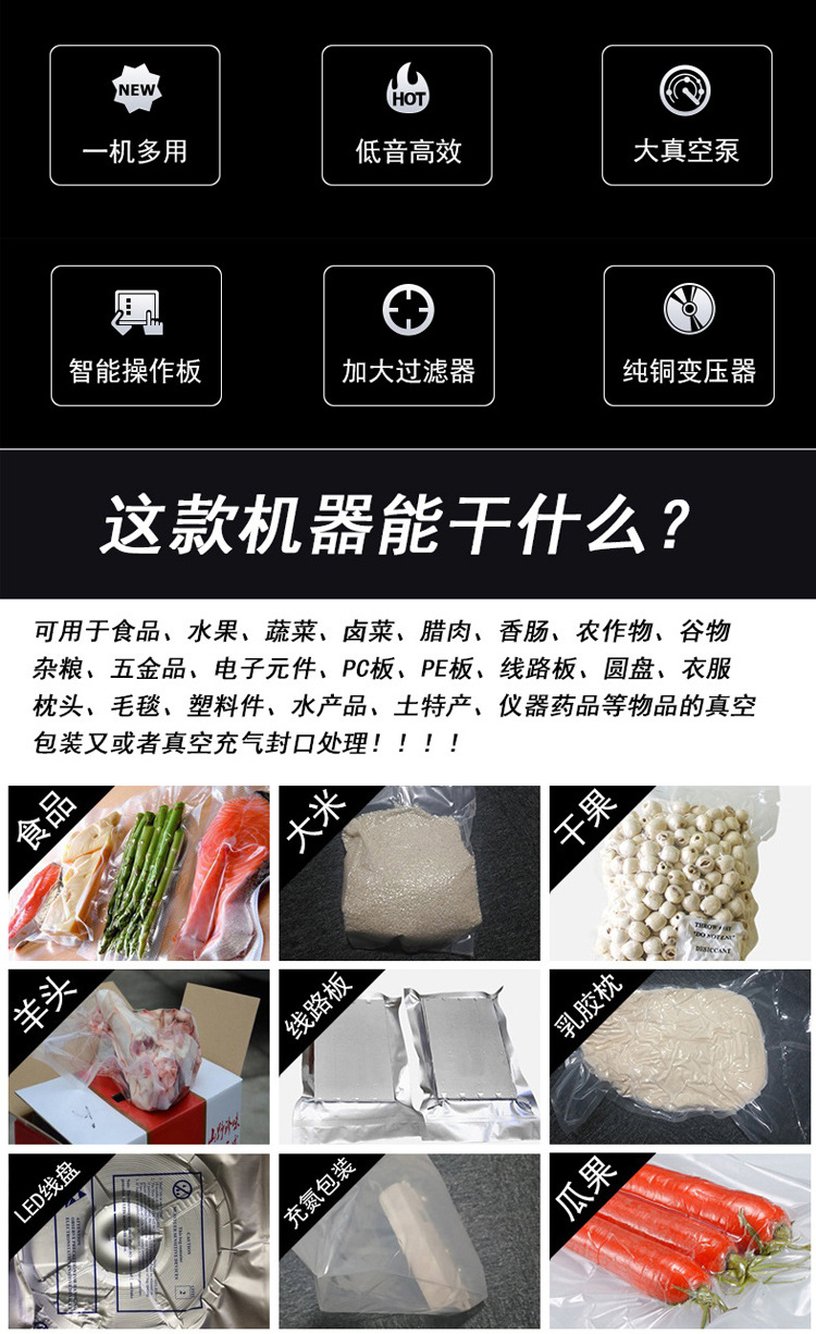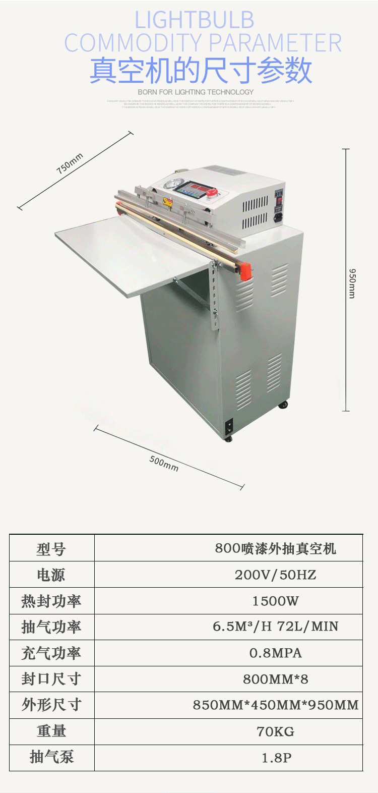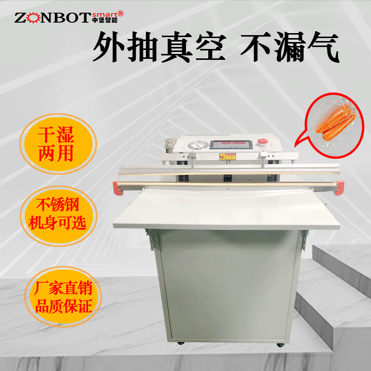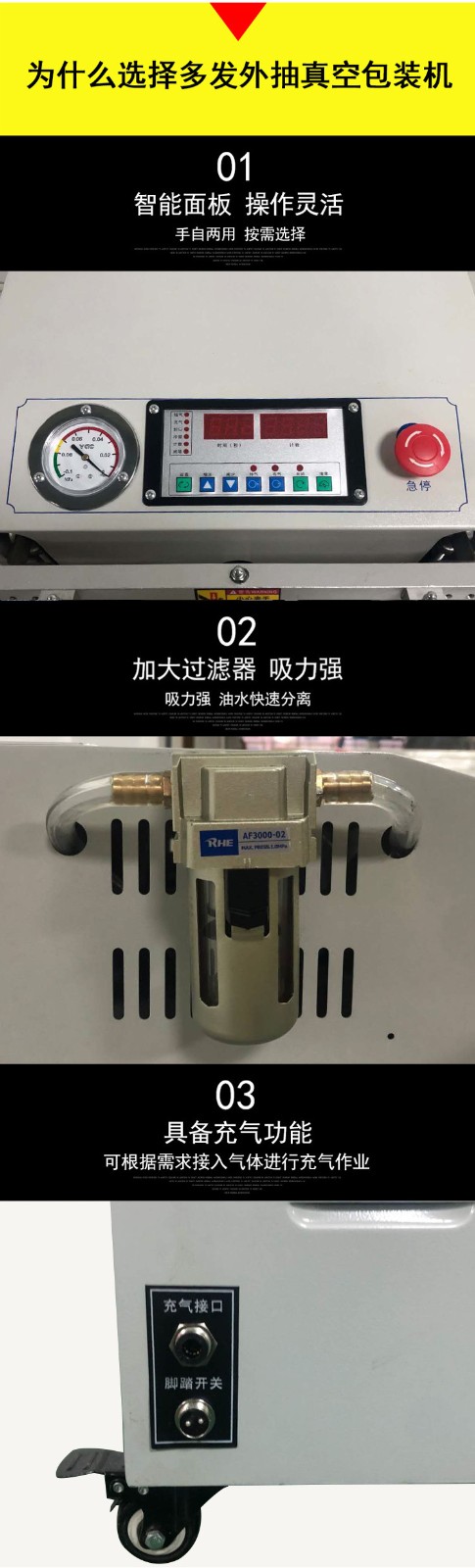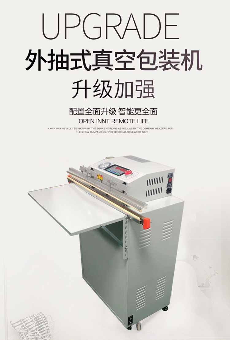 电动外抽真空包装封口机封口采用气压式,压力大,封口干净、平整、牢固,彻底改变传统包装封口不牢的现象,可有效防止包装内容物泄漏