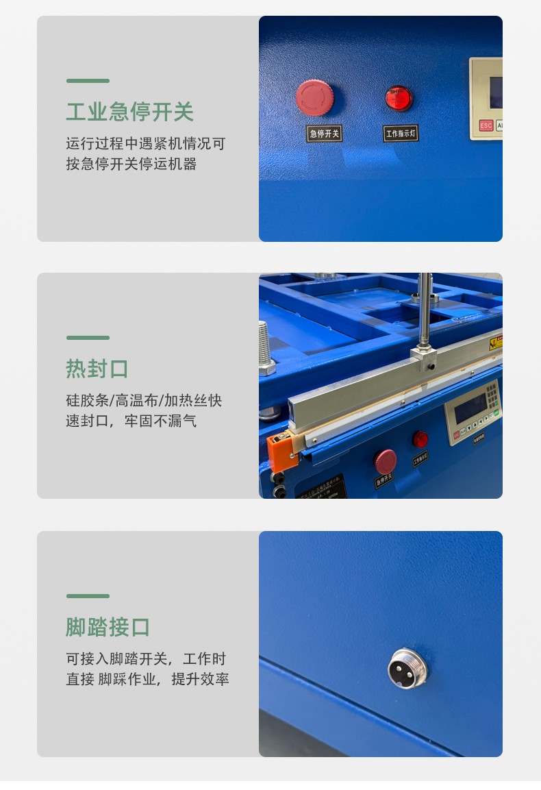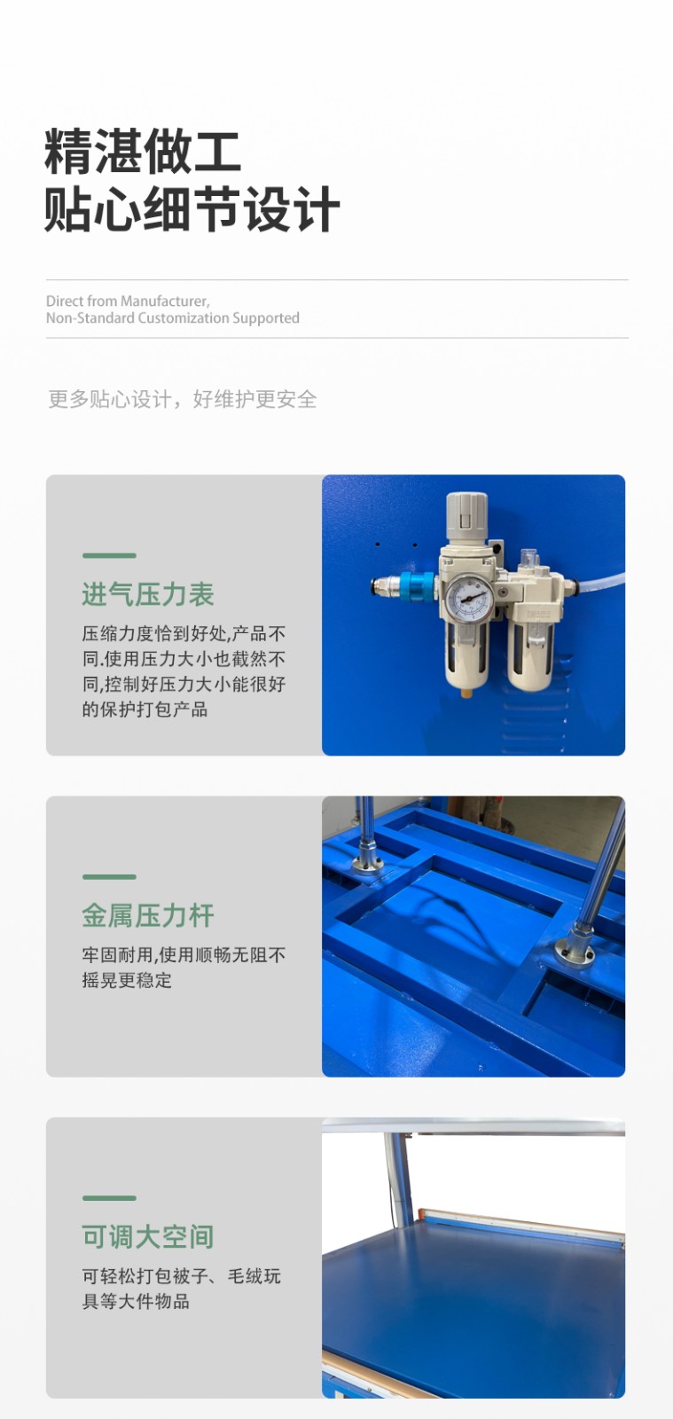 真空压缩封口机:集成抽真空功能,先抽走包装内空气(如食品袋、零件袋),再加压封口,适合需要防潮、保鲜、防氧化的场景(如肉类真空包装、精密零件防锈包装)。