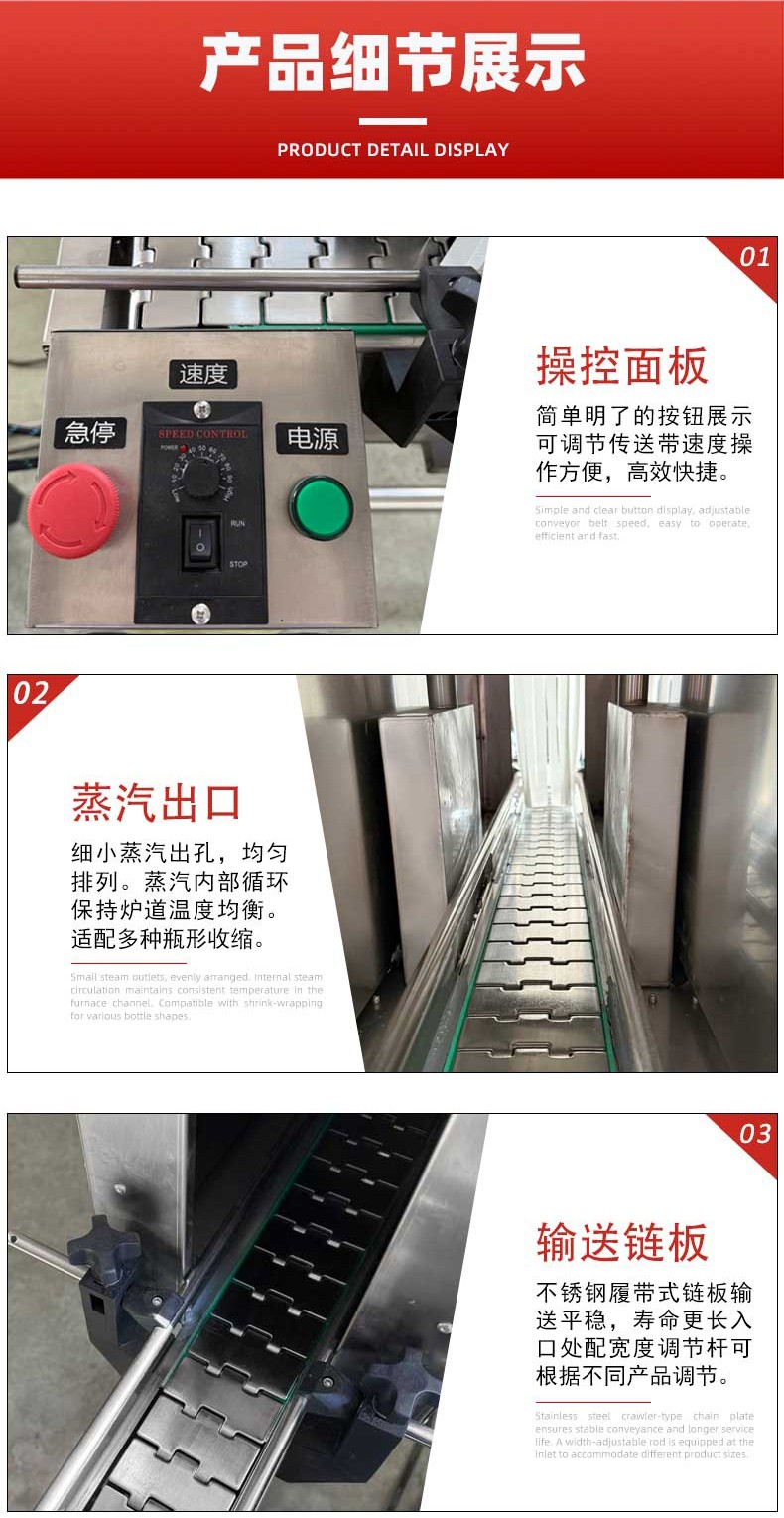 - 输送系统:用于平稳传送待包装的产品,使其能在收缩室内均匀接受蒸汽作用。