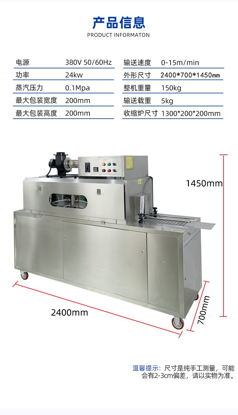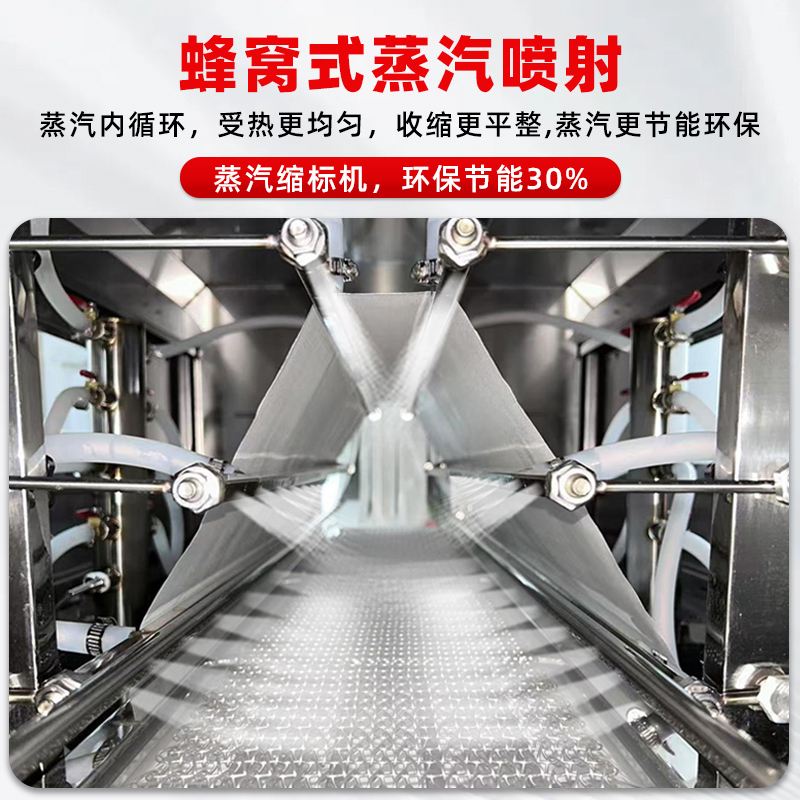 - 收缩效果均匀美观收缩室采用环形蒸汽喷射设计,蒸汽能 360° 无死角包裹产品表面,使热收缩膜受热均匀,收缩后紧密贴合产品轮廓,无褶皱、无气泡,即使是异形、棱角分明的产品(如五金工具、瓶装饮料),也能实现平整光滑的包装效果。